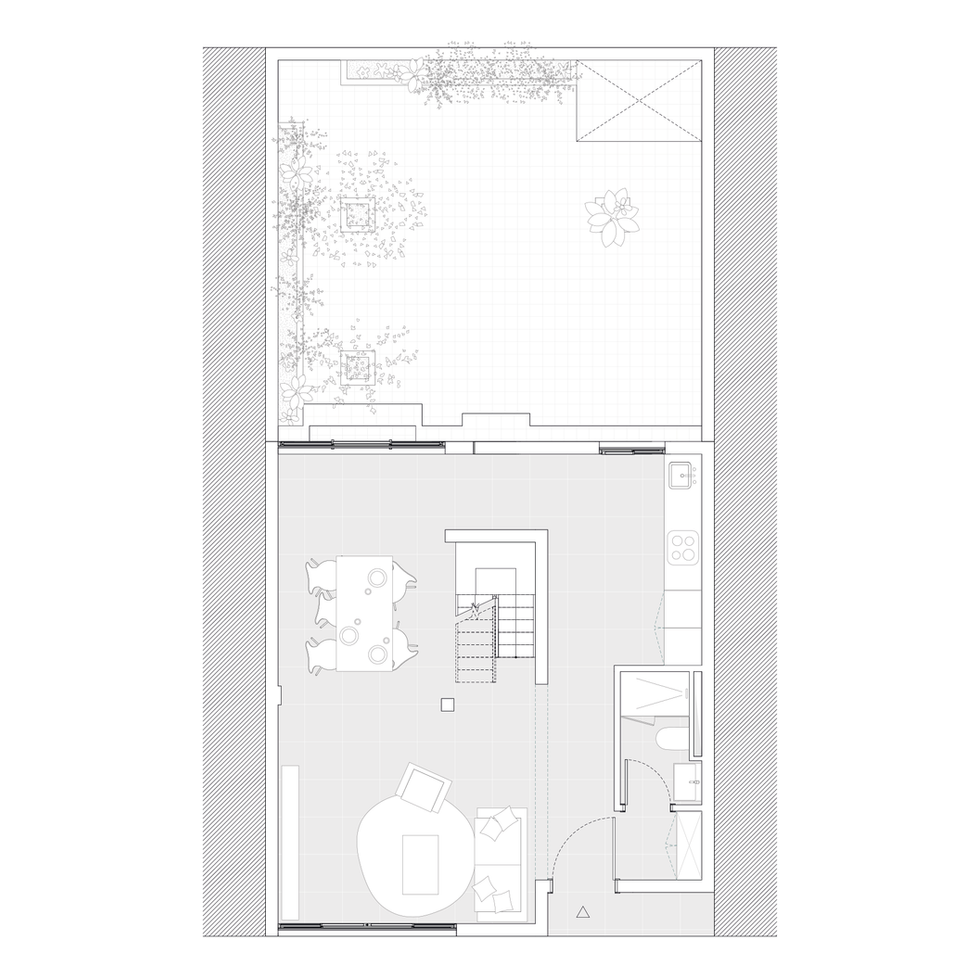 La intervención apuesta por un sistema claro de organización vertical: planta baja vinculada al jardín como espacio social y abierto; primera planta más privada, con los dormitorios; y un nuevo volumen añadido en la parte superior que alberga un espacio flexible de trabajo y estar, vinculado a una terraza que mira hacia el interior de manzana. La fachada posterior se abre al jardín con grandes carpinterías que desdibujan el límite interior-exterior, mientras que la fachada a calle mantiene una imagen más contenida y respetuosa con el entorno.